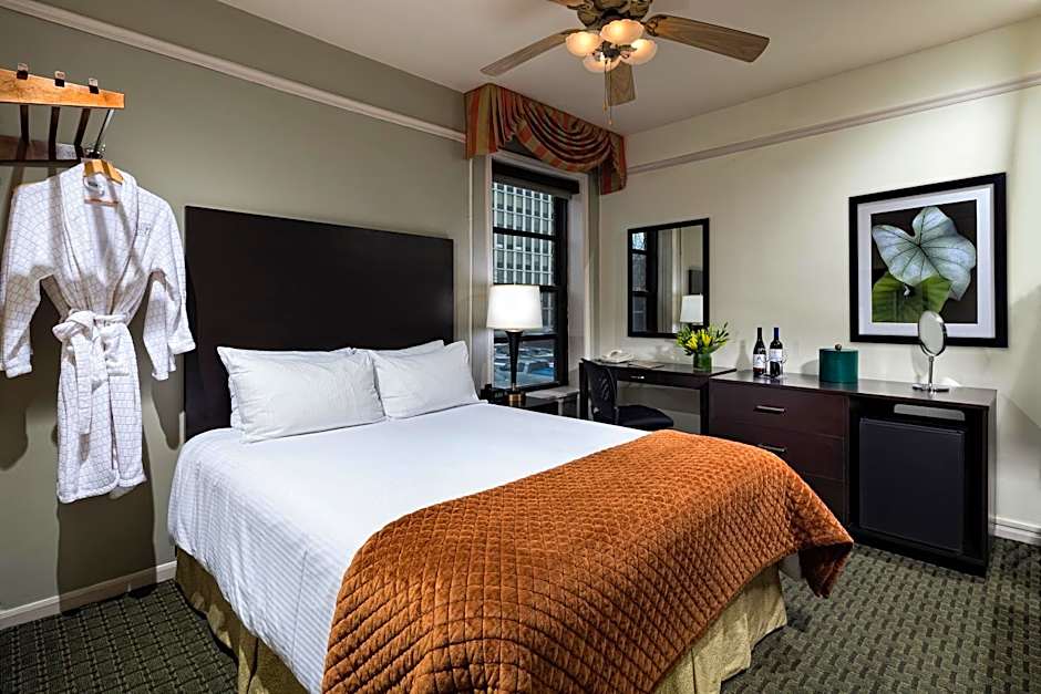 This guest room features a queen sized bed, WiFi access, a flat-screen TV with cable, plush bathrobes, luxury bath amenities and daily continental breakfast.